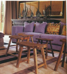 Перед диваном, обитым искусственной замшей, Стефен Фальке поместил несколько низких деревянных табуретов вместо кофейного столика. Декоративные подушки с оттенком тоффи и дерево дорогих пород — прекрасный фон для дивана.
