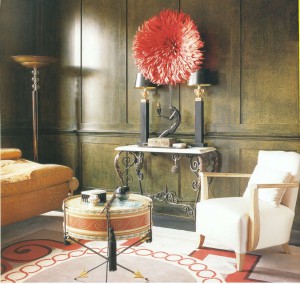 В комнате Дэвида Картера мягкий вибрирующий красный тон камерунского туземного головного убора из перьев красиво выступает на фоне табачного цвета панельной стены, на поверхности которой видны старые трещины. Красный тон повторяется в узорах ковра и в цвете столика, сделанного в форме барабана.