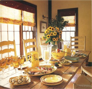 Интерьер представляет собой мягкое смешение солнечных тонов леска, подсолнечника и терракоты — с оттенками светлого шалфея и теплых красок темного дерева. Акцентами для песочного оттенка стен и деревянного сельского стола стали большие желтые тарелки, большая ваза с цветами, желтые жалюзи с терракотовыми ламбрекенами и крашеные стулья.