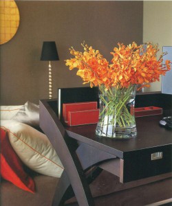 Шокирующее вторжение оранжевых, например оттенка жженого апельсина, произведено декоративной подушкой и эхом отозвалось в настольных аксессуарах и в стоящих на столе цветах. Когда таким способом акцентируется оттенок средне-серого, то краски интерьера источают теплое и насыщенное свечение. Это свечение поддерживают теплые тона дерева, из которого изготовлен столик.
