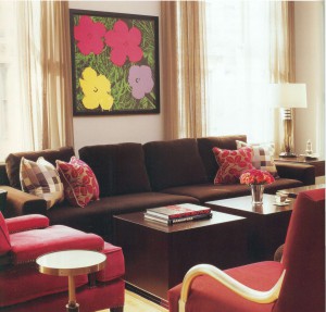 В гостиной дизайнер Джейми Дрейк обил диван тканью теплого шоколадно-коричневого тона. Стоящие напротив дивана кресла, а также подушки на самом диване решены в оттенках мадженты. Серебряного цвета акценты вносят холодную струю в этот горячий интерьер.