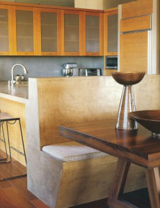 По своему колориту кухня представляет собой привлекательное и теплое смешение всех «земляных» оттенков. Для кухонного комплекса, пола, стола было использовано несколько различных сортов дерева. Древесные оттенки создали уютную пространственную зону, в которой приятно готовить и принимать пищу.